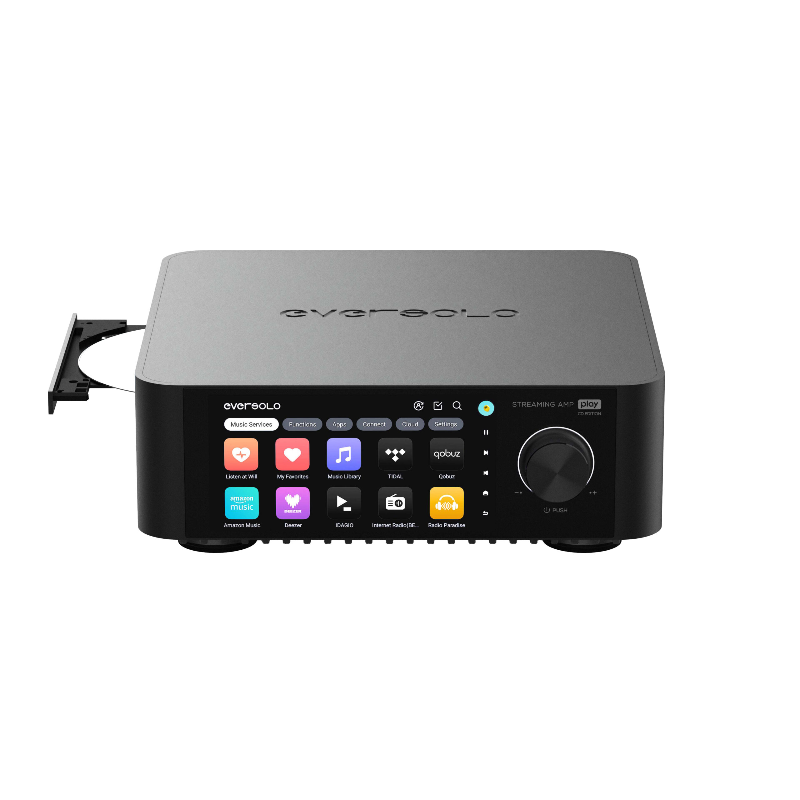 La versión CD del Eversolo Play incorpora una unidad óptica Hitachi-LG original, montada sobre un chasis con aislamiento antivibraciones. Esto reduce de forma notable las resonancias y asegura una rotación estable. Sus algoritmos propietarios de corrección de errores permiten reproducir incluso discos antiguos o rayados que parecían irrecuperables.